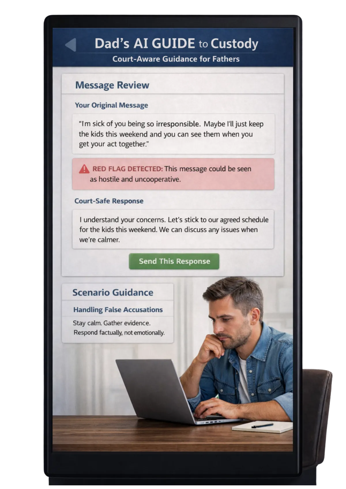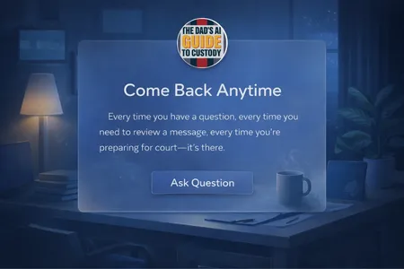 Get instant, court-aware guidance designed specifically for fathers navigating custody, available anytime, from any device.