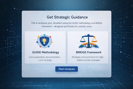 No. This is strategic guidance based on the GUIDE methodology and BRIDGE framework. For legal advice, consult a qualified attorney. The Dad's AI GUIDE to Custody helps you organize your thoughts, prepare questions, and understand court strategy, but it doesn't replace legal counsel.